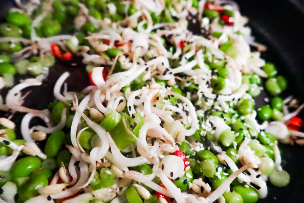 Grönsakerna är självklart utbytbara. Men det blir krispigt och gott med edamame, böngroddar, edamame som får frasas i lite kokosolja.