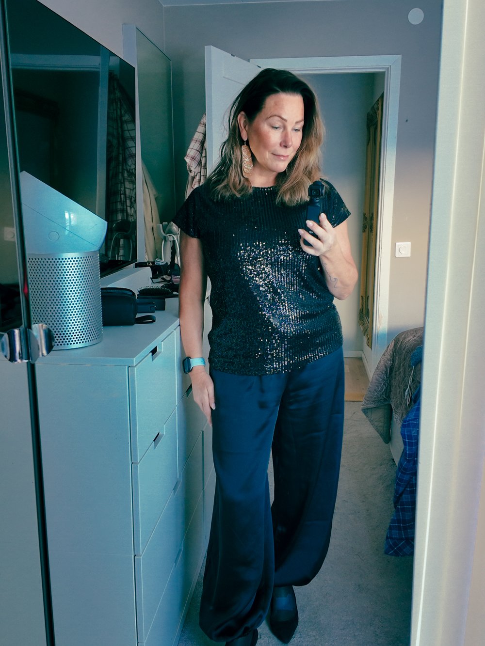 Top HÄR (finns även i guldbeige) och byxor HÄR
