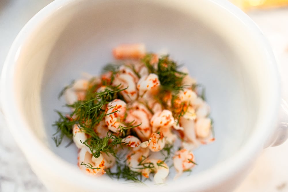 Ett alternativ är att toppa soppan lite extra med dill och hackade kräftstjärtar – vackert och tilltalande!