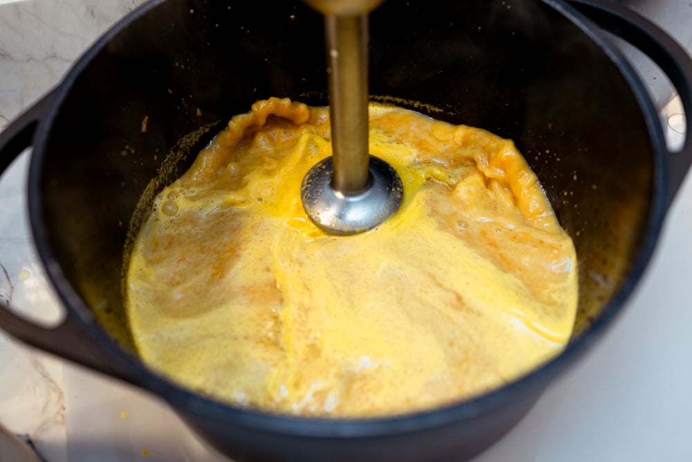 Jag föredrar att mixa soppan slät efter buljong och vit är tillsatt men det är en smaksak.