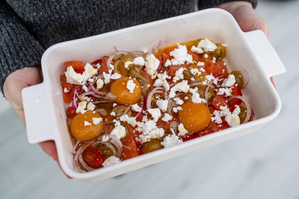 Sätt ugnen på 175 grader. Skiva tomaterna och lägg dem i botten av en ugnsform. Strö över tunt skivad rödlök och ringla lite olivolja över grönsakerna. Fördela laxen i mindre bitar mellan tomaterna. Knäck äggen direkt ner i formen och salta och peppra lätt. Baka i ugnen tills äggvitan stelnat men gulan fortfarande är mjuk om du vill ha den så. Ta ut formen och pressa lite citron över innan servering. Toppa med gräslök.