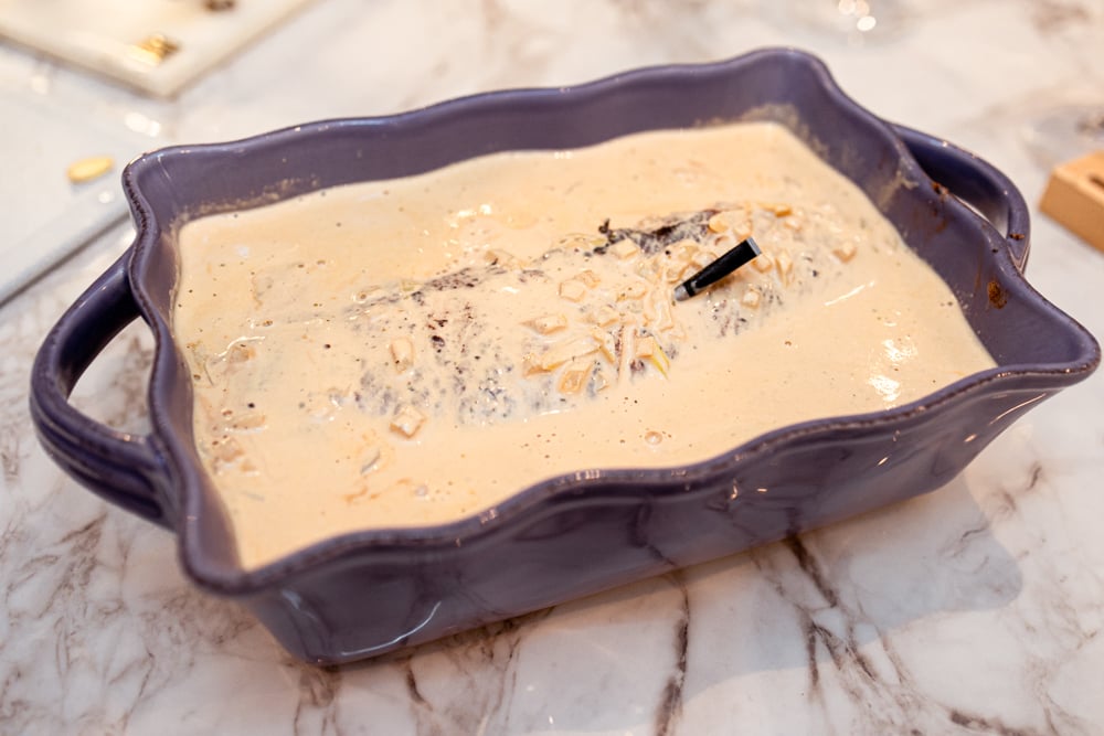 Ner i form med termometer. S¨sen hälls över så den i princip täcker filén.