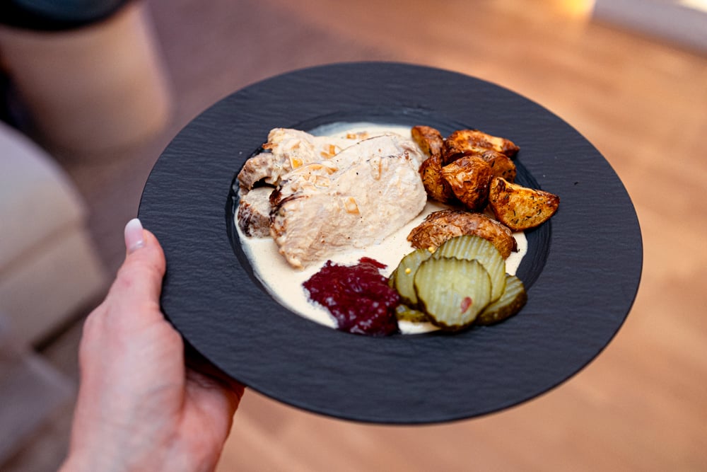 Köttet får sedan vila i såsen (då höjs temperaturen till ca 63) och sedan tar jag upp köttet, skär det i skivor och serverar!