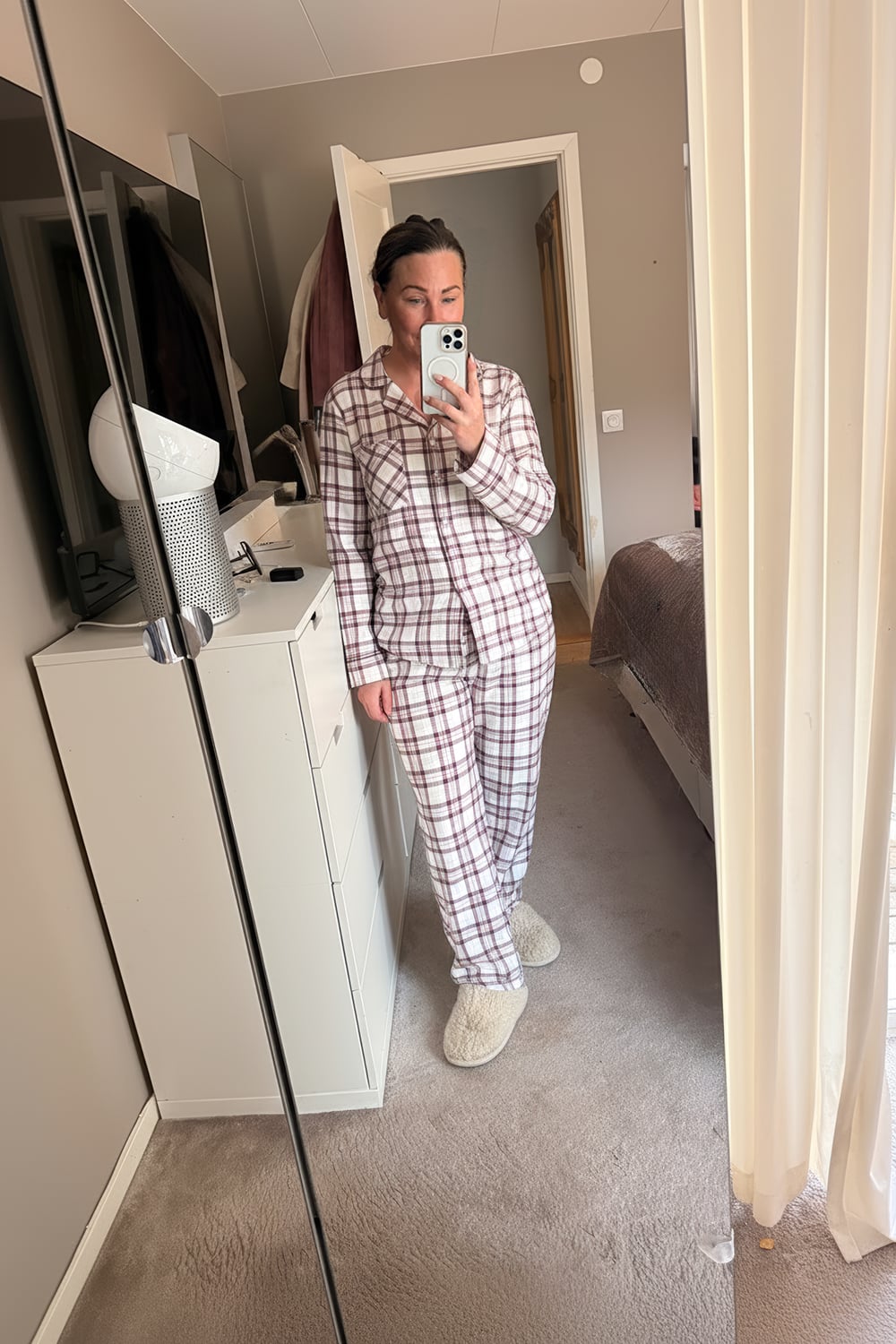 Jag sitter och jobbar i soffan till en julfilm – fortfarande i pyjamas, haha!