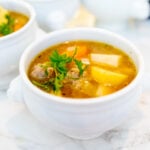 Lägg sedan försiktigt ner frikadellerna i den sjudande soppan. Låt allt småkoka ytterligare 8–10 minuter tills frikadellerna är genomkokta och grönsakerna är mjuk. Smaka av med salt & peppar.
