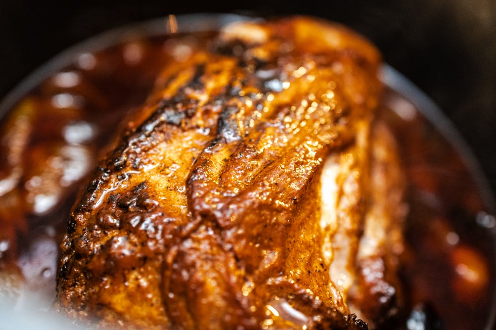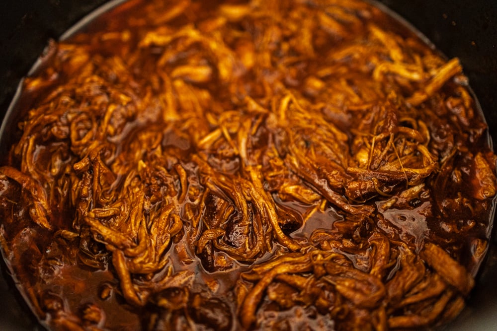 Tillaga på låg värme i 7–8 timmar eller på hög värme i 4–5 timmar. Ta även här bort kanelstången efter cirka halva tiden. När köttet är så mört att det går att dra isär med två gafflar är det klart.