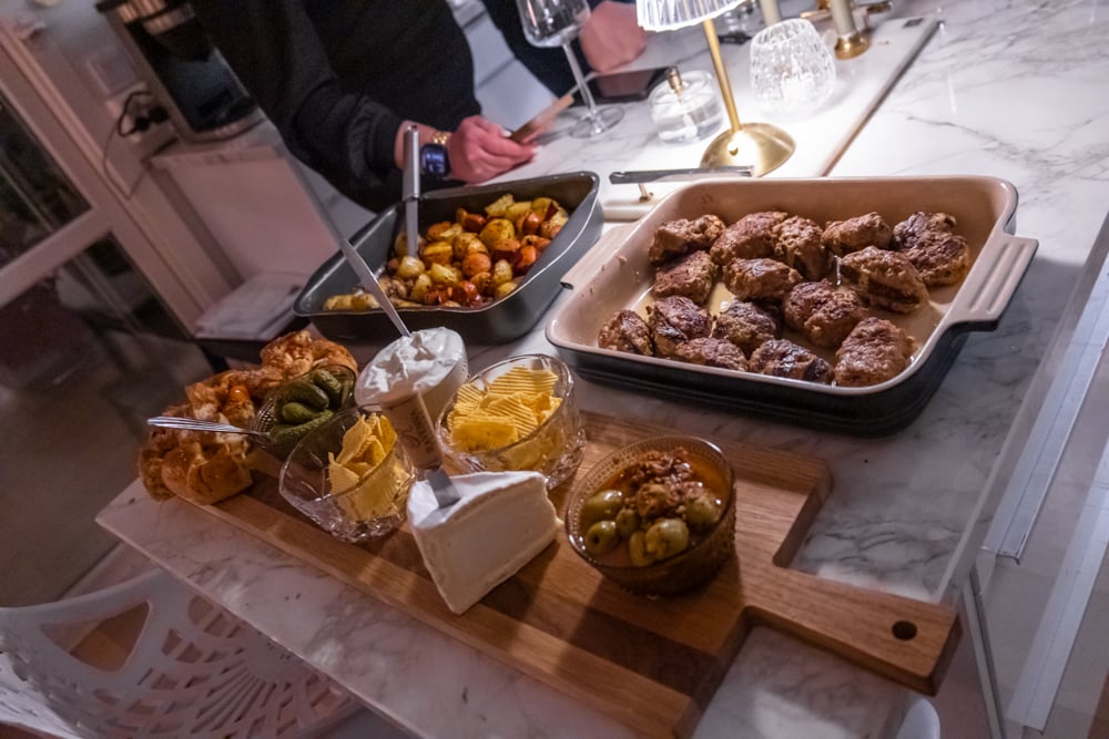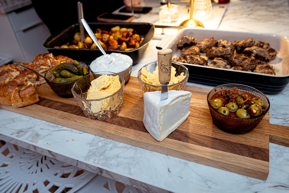Foccacia från ica Maxi, Chornicons, tzatziki, Brillat savarin (ÄLSK!!) och manchego oliver.