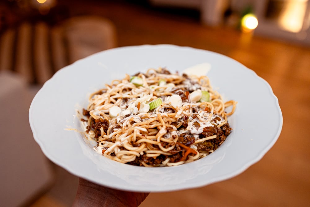 Här är det serverat med nudlar till Alice och sojamajjomnäsen är supergod att ringla över.