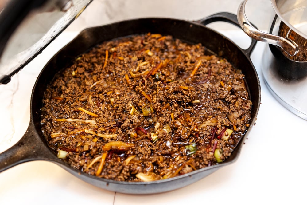 Stek färsen på hög värme tills den får färg och tillsätt lök, ingefära och vitlök. Låt fräsa någon minut. Blanda soja, sesamolja, risvinäger, oystersås och chiliflakes i en skål och häll ner i färsen. Låt småputtra i fem minuter och späd med vatten, smaka av med salt och peppar. Rör ner kål och morötter och hälften av salladslöken.