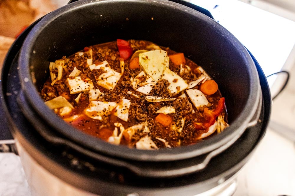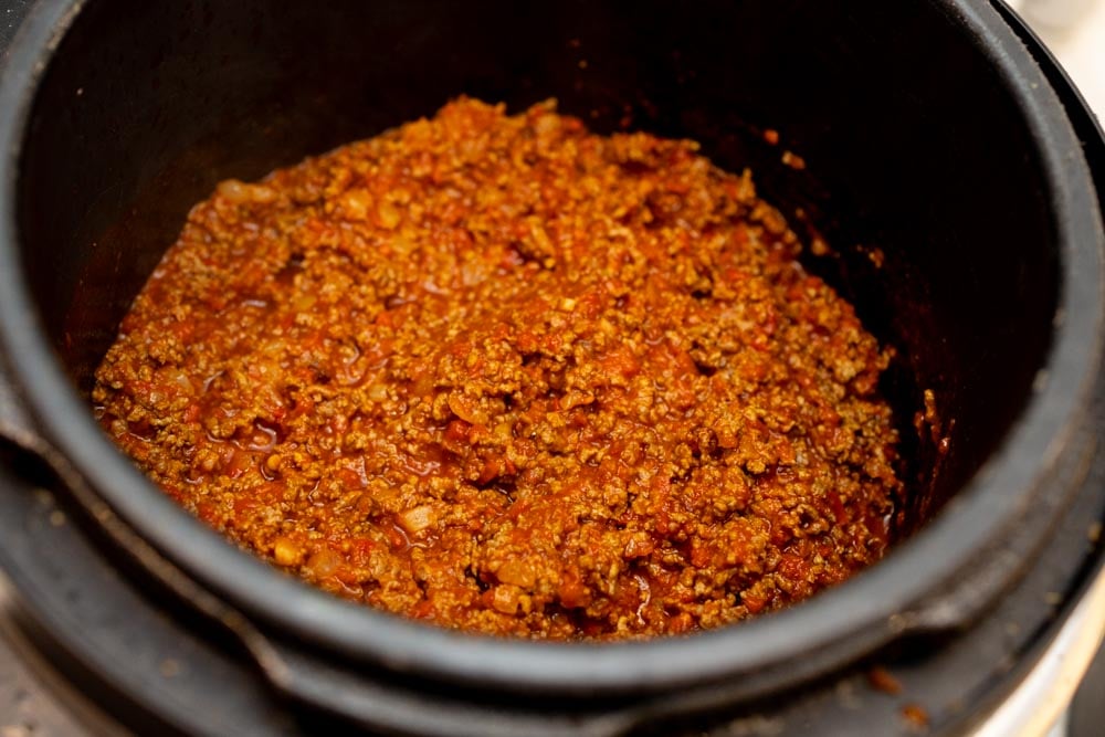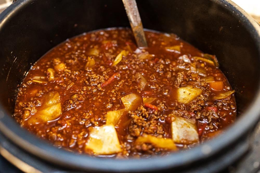 Använd sauté-funktionen i grytan och fräs lök och vitlök i lite smör. Tillsätt nötfärsen och bryn tills den är genomstekt. Krydda med paprikapulver, curry, sambal oelek och peppar.