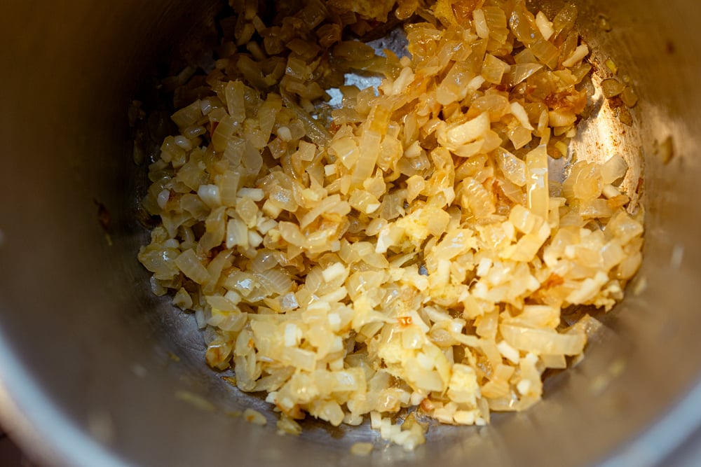 Här har löken fått fräsa i olivolja på låg värme och sedan har riven ingefära och finhckad vitlök gått ner och fått fräsa med en stund.