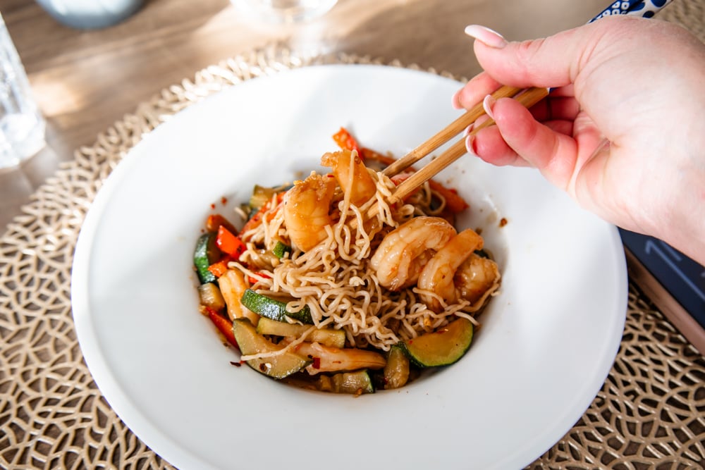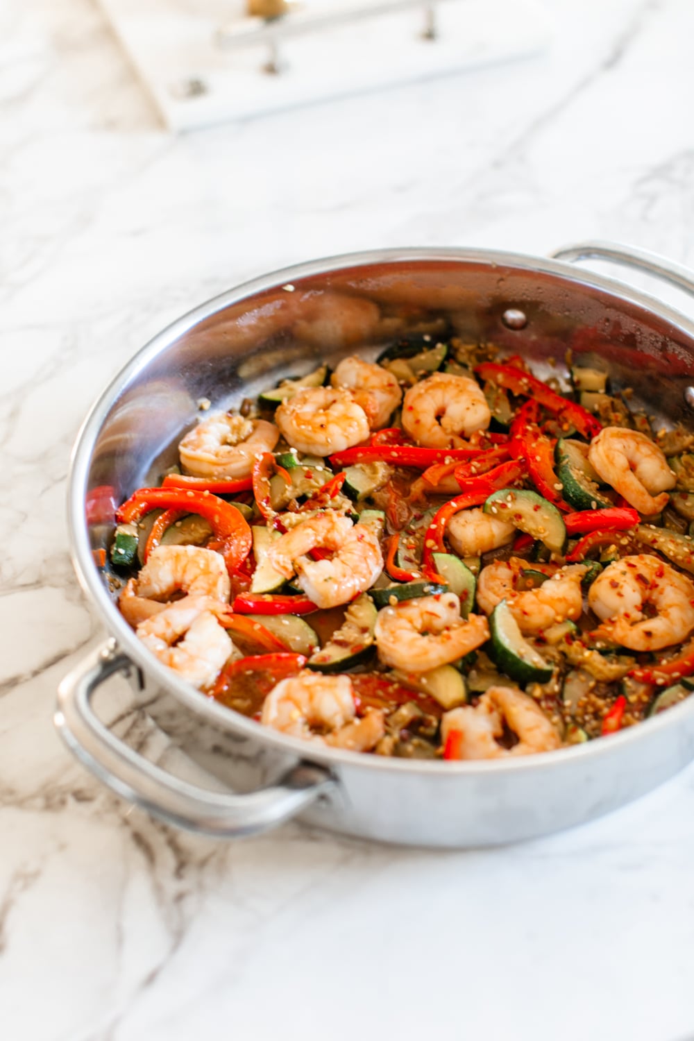 Strimla zucchini och paprika. Hetta upp en panna med kokosolja och stek grönsakerna tills de mjuknat lite men fortfarande har tuggmotstånd. Tillsätt vitlök och ingefära. Rör ner räkorna snabbt tillsammans med citron, sesamolja och soja.