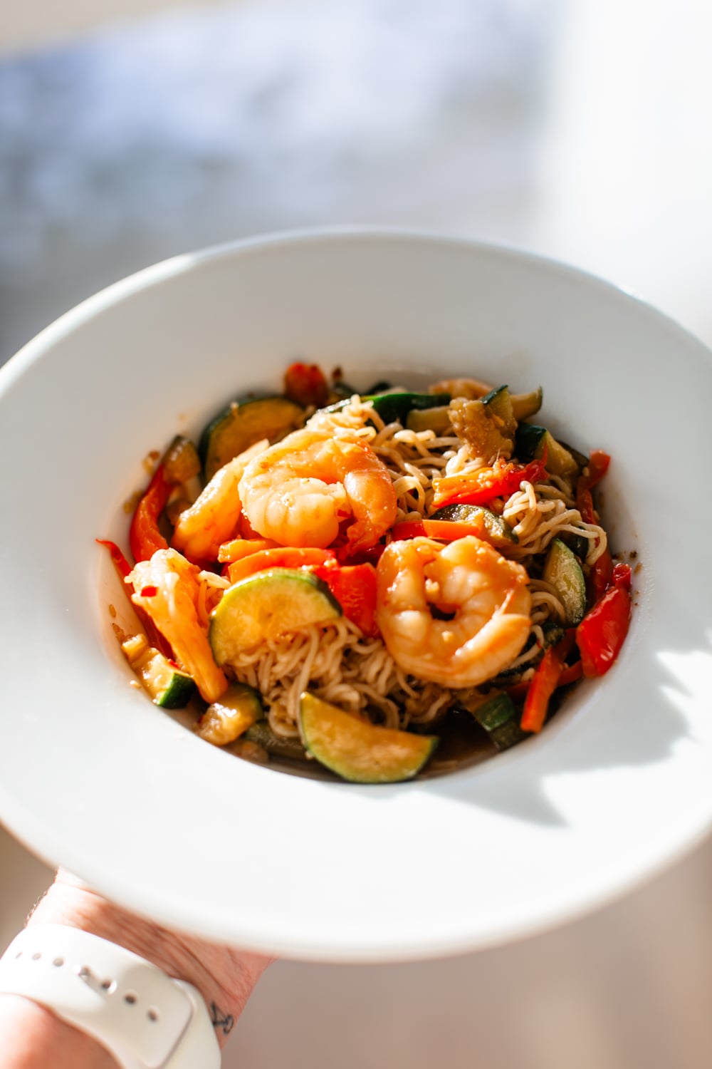 Jag köpte lite av mina favorit shirataki nudlar (glutenfria, kolhydratfria) som kom i helgen så jag tinade lite räkor och svängde ihop detta.