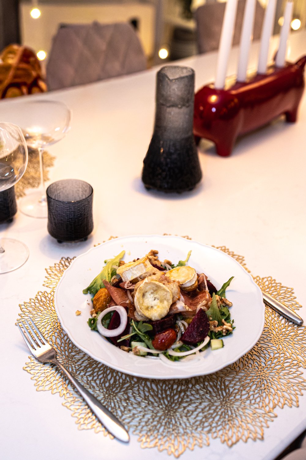 Lägg salladen i djupa tallrika, skeda dressingen över. Lägg på lök, gurka, rödbetor, lufttorkad skinka, chevre chaud och grovt hackade valnötter.