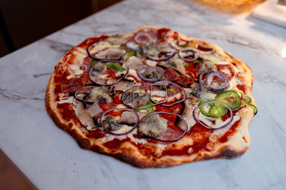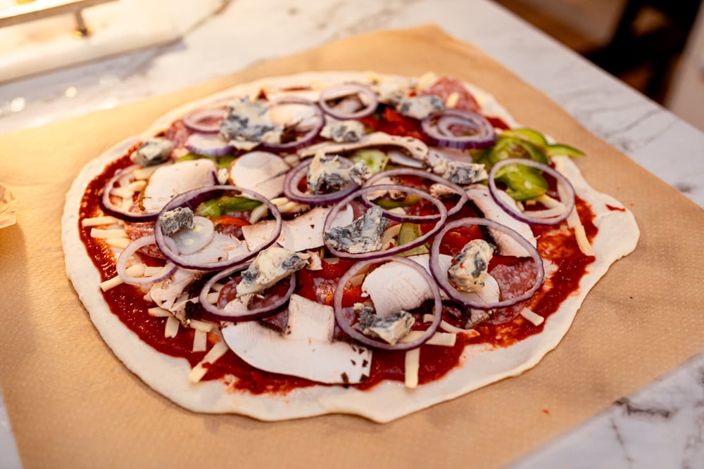Tomatsås, riven lagrad ost, salami, röd & grön paprika, gorgonzola, champinjoner, rödlök.