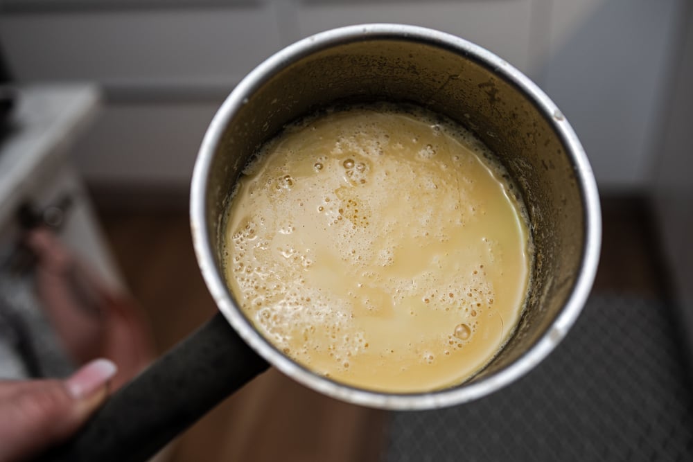 Brynt sandefjordssås: Smält smöret i en kastrull på medelvärme. Låt det bubbla tills det börjar dofta nötigt och får en gyllenbrun färg. Det ska dofta nästan som kolasås. Ta av från värmen direkt när det fått fin färg så att det inte bränns.