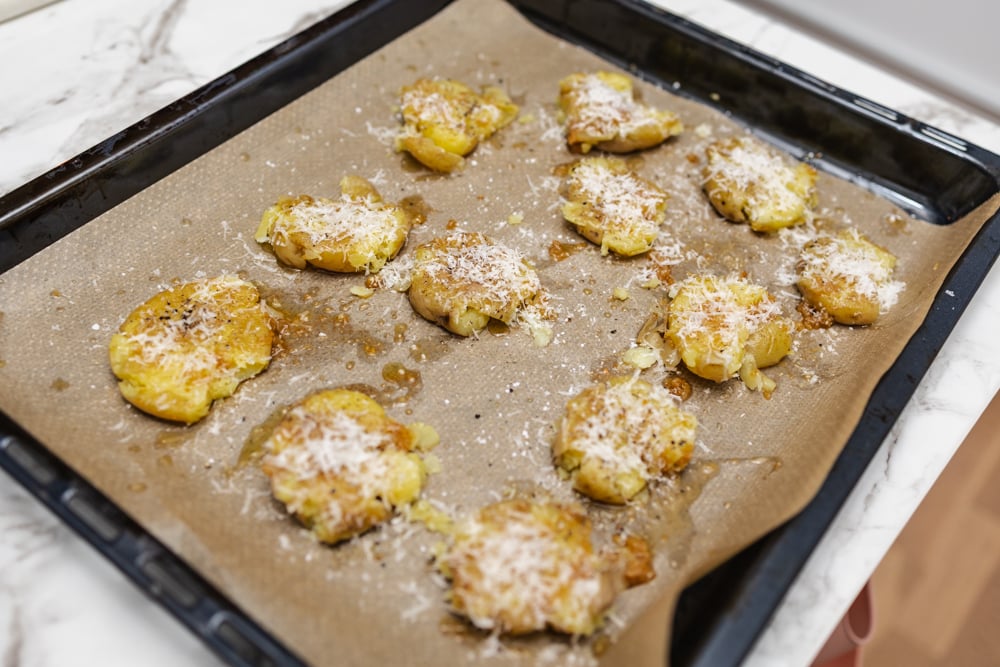 Börja med smashed potatis eller blomkål så att den kan bli riktigt gyllene i ugnen medan du lagar resten.
